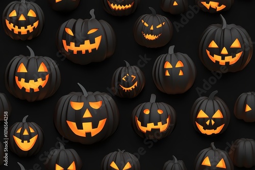 Halloween glowing jack-o'-lantern faces on a black background, a seamless pattern in a cartoon style