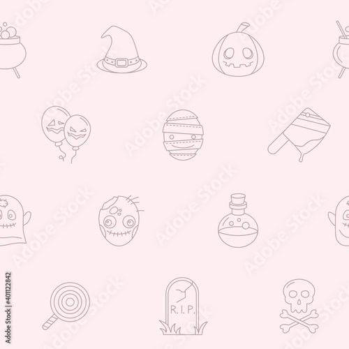 Halloween holiday - Vector background (seamless pattern) of pumpkin, ghost, bat, spider, skull, cat and others for graphic design