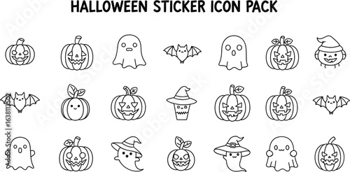 Halloween icon set featuring pumpkins ghosts and bats in outline style