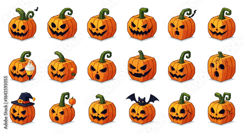 Halloween Icons Set of Expressive Isometric Halloween Pumpkins A Spooky Character Collection. Vector Illustrations. EPS Editable