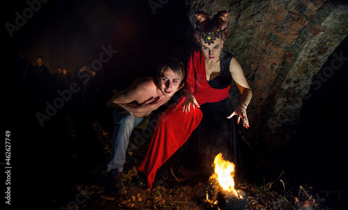 Halloween. Images of the dead vampires and witches. Man and woman vampires conjure near the fire.