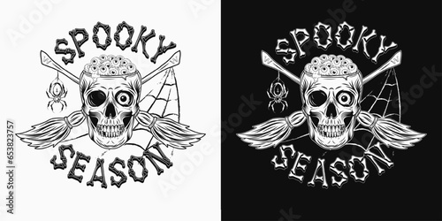 Halloween label with skull without top full of eyeballs, criss crossed brooms, grunge silhouette of spider, spider web, bone text Spooky Season. Vintage style