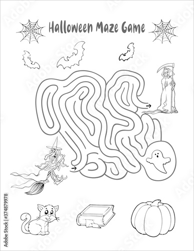 Halloween maze game. Bats and witch. Worksheet for kids. Maze for kids. Halloween activity page