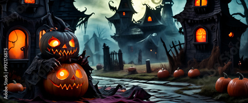 Halloween monster with a carved scary pumpkin head with an evil smile against a background of whimsical haunted houses. Autumn Halloween card or poster. Copy space for advertising text