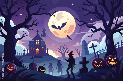Halloween Night Cemetery Scene With Full Moon