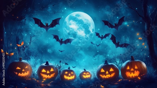 Halloween night spooky background with pumpkins and flying bats. Art cover horror night. October 31 holiday evening promotional artwork. Typography