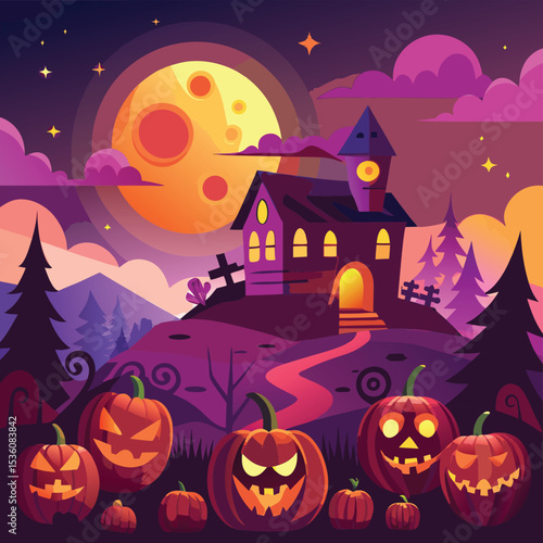 Halloween Night Spooky House Scene Carved Pumpkins Orange Yellow Purple Night Sky vector
