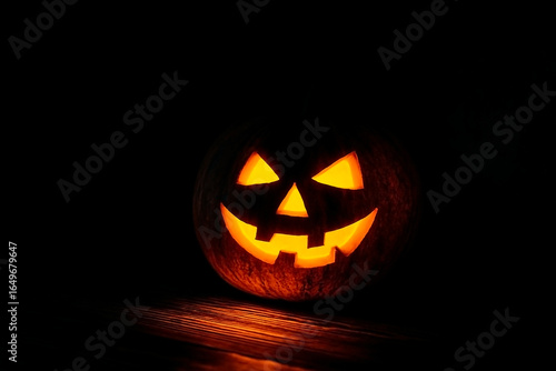 Halloween night with glowing jack-o’-lantern on wood, surrounded by deep shadows and mystery