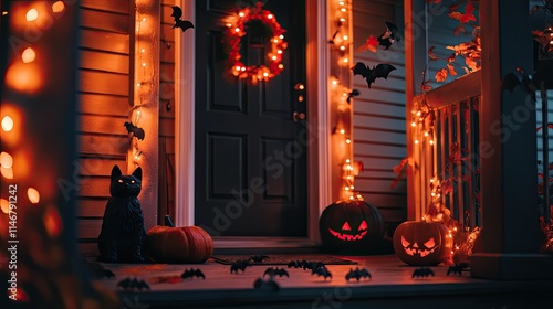 Halloween porch decorated with pumpkins, cat, bats, lights, and wreath.