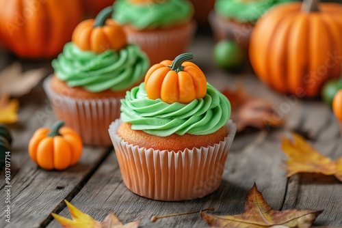 Halloween Pumpkin Cupcakes with Green Frosting and Fondant Pumpkins on Rustic Wooden Table with Autumn Leaves