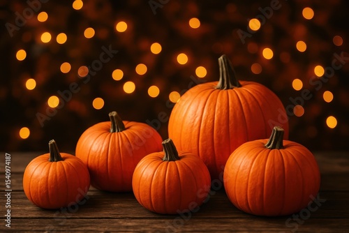 Halloween pumpkin decoration display on rustic wooden table with warm bokeh lighting effects