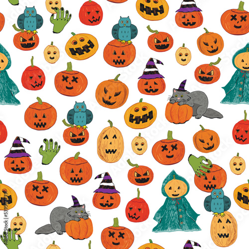 Halloween pumpkin doodles seamless vector pattern.