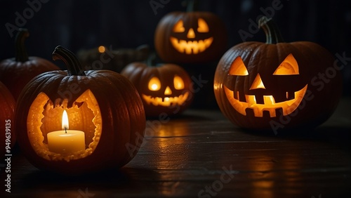 Halloween Pumpkin head jack lantern on wooden plank with burning candles on blurred background