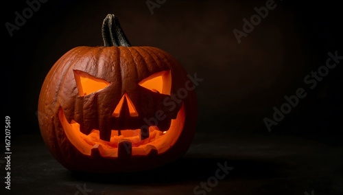 Halloween pumpkin head jack-o'-lantern on dark background with copy space.