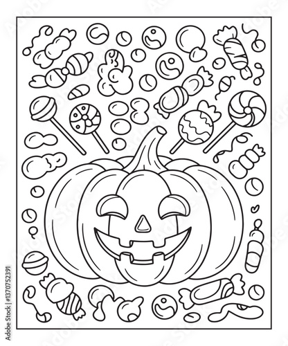 Halloween pumpkin with chocolate and lollipops coloring page for kids, black line art vector illustration on white background