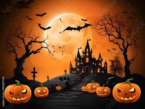 Halloween pumpkins, bats, cemeteries, and terrifying castles against the backdrop of the big orange-colored moon on a spooky evening.