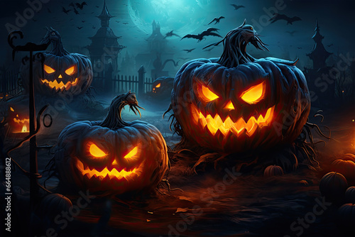 halloween pumpkins illuminate in the woods with moon as the moon nears