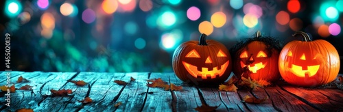 Halloween pumpkins on a wooden table with a blurred background of colorful lights and bokeh a spooky Halloween decoration