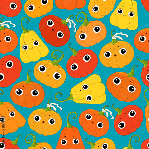 Halloween pumpkins pattern. Halloween pumpkins Jack lantern light. Colorful cute pumpkin on dark blue backdrop. Squash Fabric textile texture. Halloween background jack pumpkin face. Cartoon pumpkins