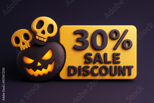 Halloween Sale Discount Promotion with Pumpkin and Skulls 3D Render on Dark Background for Seasonal Marketing Campaign