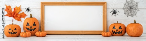 Halloween scene with carved pumpkins, spider webs, and autumn leaves on a wooden background.