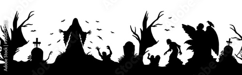 Halloween seamless panorama with halloween silhouette of cemetery elements for holiday background