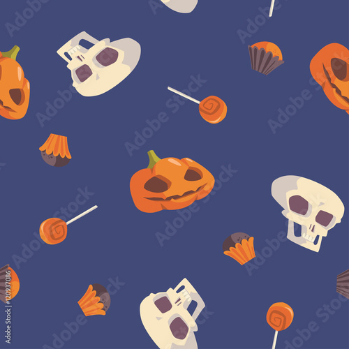Halloween seamless pattern. Vector background with hand drawn halloween symbols and sweets