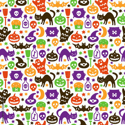 Halloween seamless pattern with cat, pumpkin, bat, ghost, skull . Vector illustration.