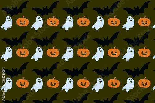 Halloween seamless pattern with pumpkins, bat and ghosts on a green background.Wrapping paper.