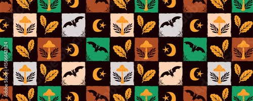 Halloween Seamless Pattern with Silhouettes of Bats, Mushrooms, Leaves, and Crescent Moons in Autumn Colors. Cozy fall design in hand-drawn style perfect for seasonal decor, textiles, stationery, and