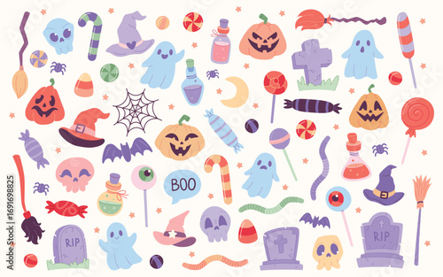 Halloween set with pumpkins, ghosts, candies, potions, hats, brooms, skulls and decorations.