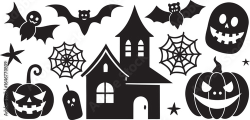 Halloween Silhouette Vector Set Bats Haunted House Pumpkins and Spiderwebs