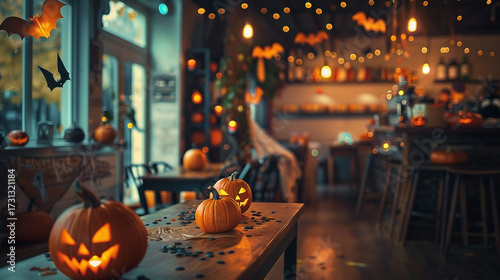 Halloween Spirit Embraces Cafe: Festive Pumpkins and Bats Setting Spooky Ambience