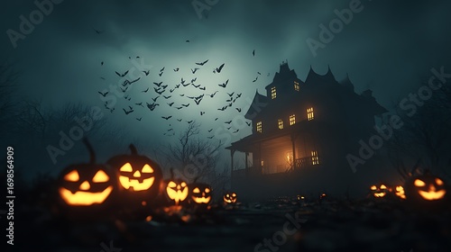 Halloween spooky haunted house glowing pumpkins bats flying cinematic dark foggy night