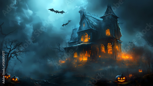 Halloween spooky night with a haunted house and bats, halloween background. Haunting - Ruins. Illustration