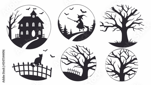 Halloween Spooky Silhouette Set Haunted House Witch Tree Cat Bats Design Decoration Autumn Fall