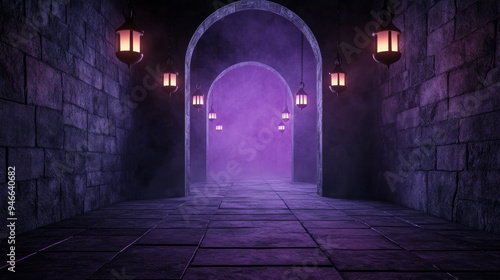 Halloween store entrance surrounded by floating candle flames, hanging spider ornaments, Gothic style arches, dark purple and black color theme, eerie mist rising from cracked stone floor