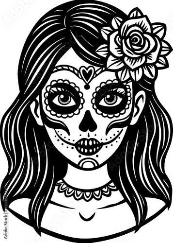 Halloween Sugar Skull Girl Coloring Page Vector Art with Intricate Floral Patterns for Day of the Dead Activities Generative AI