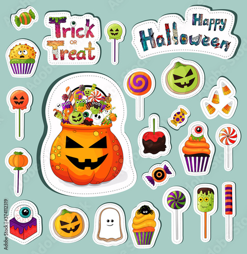 Halloween sweets stickers set. Many types traditional halloween desserts. Trick or treat elements, design treats icons collection. Treat bowl, candy, apples, eyeball, jelly. Scrapbook template images.