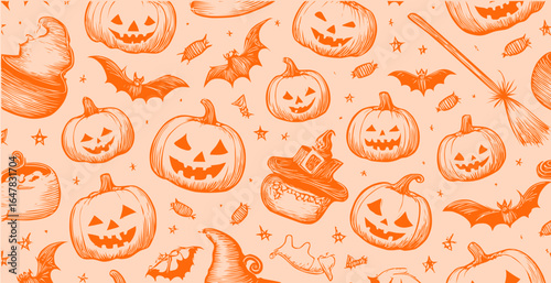 Halloween themed, hand drawn simple autumn pattern. Fall print with pumpkins and other elements drawn in vector, detailed wallpaper