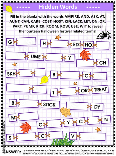 Halloween themed hidden words game or puzzle (English language). Answer included.