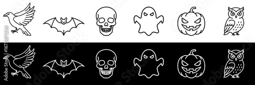Halloween themed monochrome isolated vector images, seamless border, two design options on transparent and black backgrounds, pencil drawing, chalk drawing