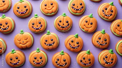 halloween themed pumpkin gingerbread cookies with kawaii faces on a pastel purple background