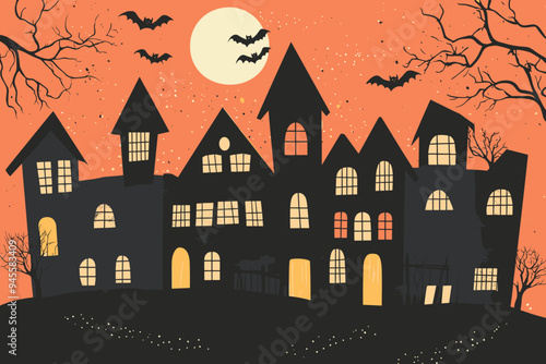 Halloween town silhouette of haunted houses, bats, pumpkins and a full moon with a scary feeling