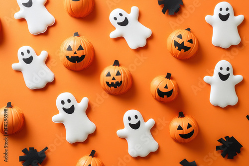 Halloween treats on an orange background: candy corn, pumpkins, and spider cookies arranged in a festive display.