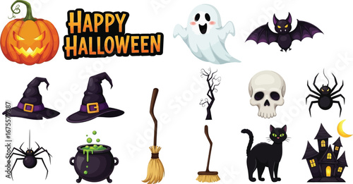 Halloween vector illustration set with pumpkin, ghost, bat, witch hat, broom, skull, spider, cat and castle