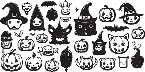 Halloween Vector Set – Pumpkins, Witch Hat, Cat, Bat, Ghost, Scary, Spooky, Cartoon, Illustration, Icon, Outline, Creative, Black and White, Symbol, Doodle, Holiday, Autumn, Design
