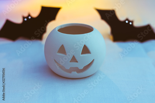 Halloween white pumpkin in front of two bats with luminous eyes on a white and colorful background