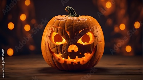 Halloween-themed real Jack O' Lantern with an orange backdrop created by generative AI