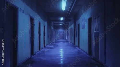 Hallway in a mysterious anime school basement with multiple doors leading to unknown areas. --ar 16:9 --v 6.1 Job ID: 2d4fa615-a7c7-4f41-a655-0393b1e307b5